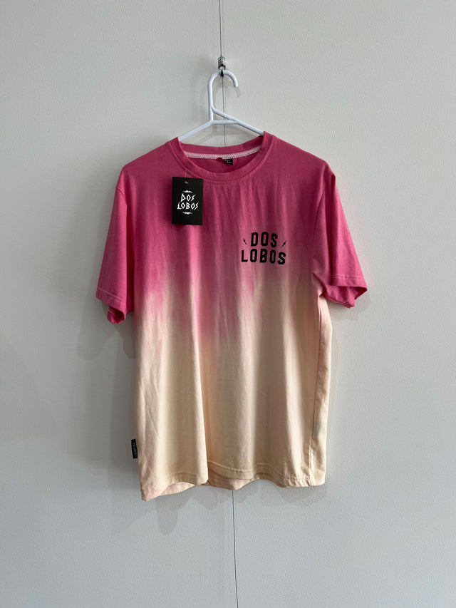 The Dos Lobos High Cherry Crush Ss T-Shirt has been hand dip-dyed by T/S/O/B/G with a Cherry Red fade from the shoulders down into fluoro yellow at the hem. It's a crew neck with a regular fit and slightly longer length. "Dos Lobos High" logo is printed on front and rear.