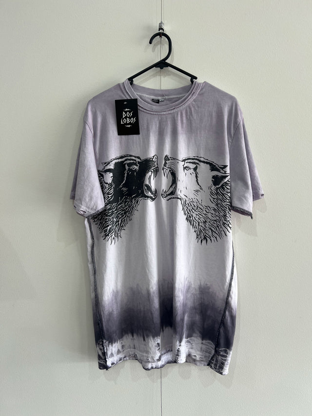 It has reversed overlock side seams (black stitching on the side seams) and a reverse sewn neckline. Face-to-face wolves lock-up printed across chest with Dos Lobos Logo printed on rear neck. This particular T-shirt design has been ravaged and features intentionally hand-torn distressed hem lines and ulcerated cuts as part of the look, these cuts and tears are not considered defects and are intentional as part of the overall aesthetic, adding further value and uniqueness to each garment. These will accentuate with each wash and become more worn.
