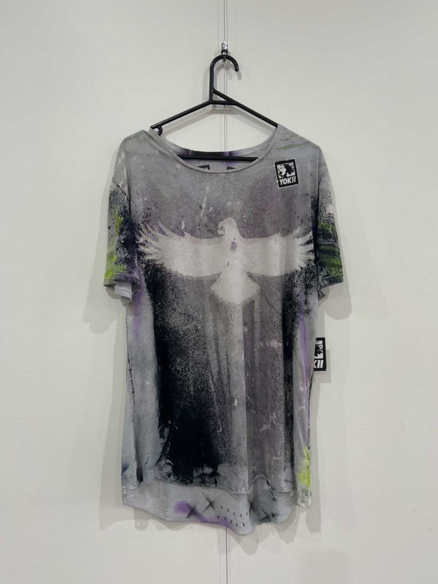 ASCENSION - This is a one-of-a-kind original, premium hand dyed & printed T-shirt by Yokii - It is a 100% Pure cotton light weight T-Shirt featuring distressed hem lines and ulcerated cuts as part of the design, these cuts and tears are not considered defects and are intentional as part of the overall aesthetic, adding further value and uniqueness to each garment. Sewn in Bali, hand-printed and crafted in Australia by the artist Craig Woodroff.
