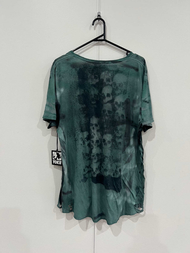 CATACOMBS - This is a one-of-a-kind original, premium hand dyed & printed T-shirt by Yokii - It is a 100% Pure cotton light weight T-Shirt featuring distressed hem lines and ulcerated cuts as part of the design, these cuts and tears are not considered defects and are intentional as part of the overall aesthetic, adding further value and uniqueness to each garment. Sewn in Bali, hand-printed and crafted in Australia by the artist Craig Woodroff.